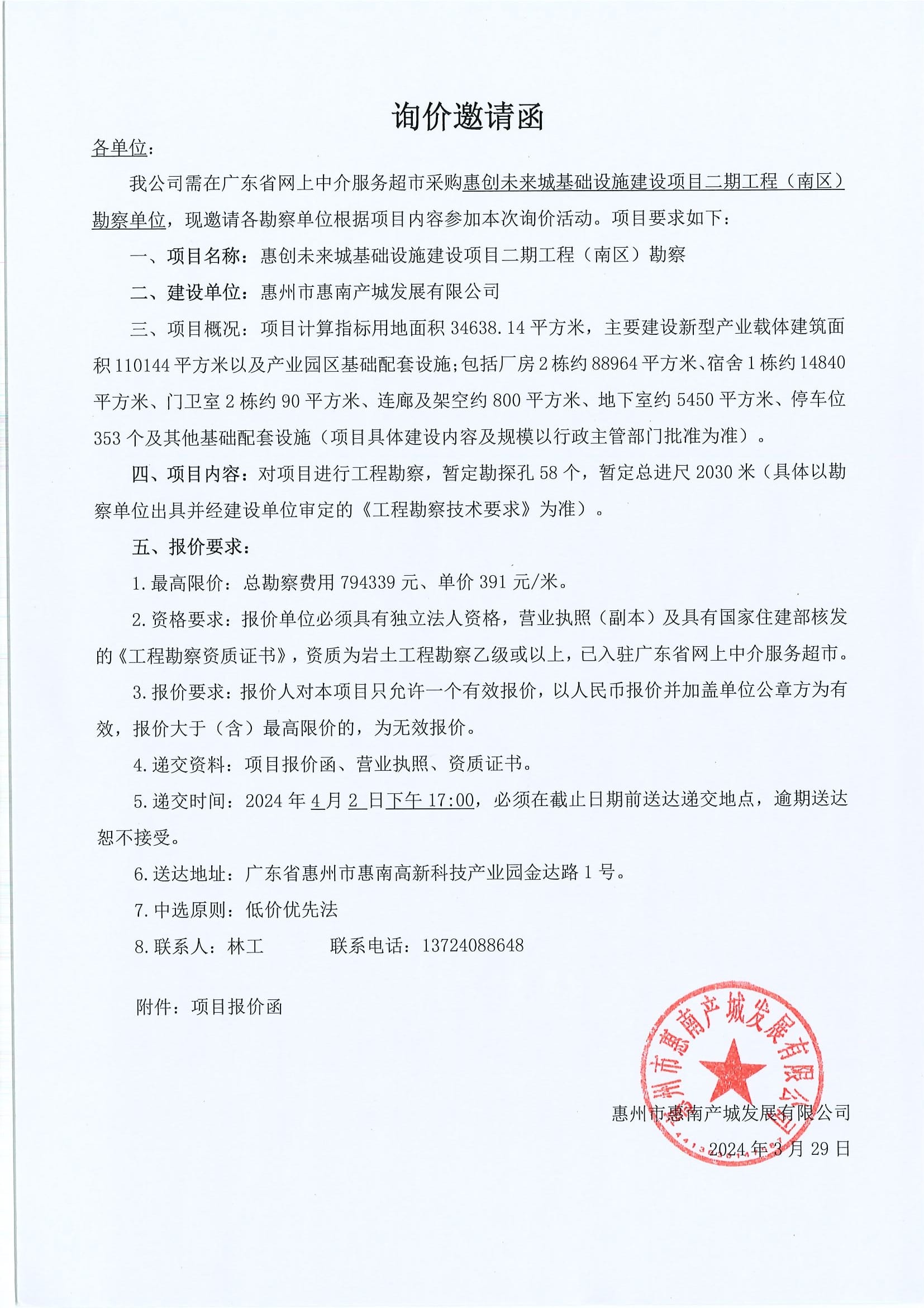惠創(chuàng)未來城基礎(chǔ)設(shè)施建設(shè)項目二期工程(南區(qū))勘察詢價邀請函