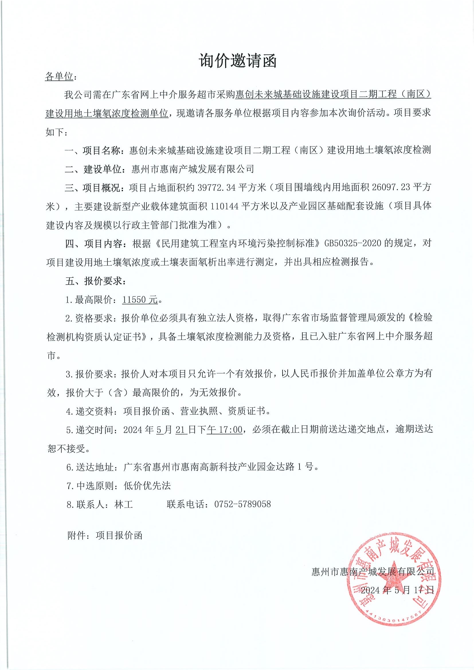 惠創(chuàng)未來城基礎(chǔ)設(shè)施建設(shè)項(xiàng)目二期工程(南區(qū))建設(shè)用地土壤氡濃度檢測服務(wù)詢價(jià)邀請函