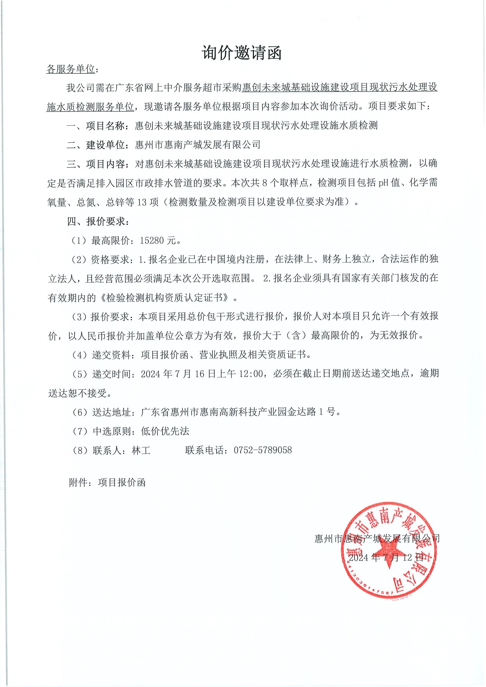 惠創(chuàng)未來城基礎(chǔ)設(shè)施建設(shè)項(xiàng)目現(xiàn)狀污水處理設(shè)施水質(zhì)檢測詢價邀請函