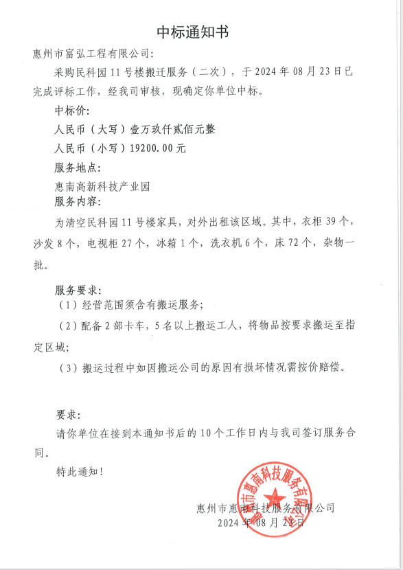 【中標(biāo)通知】采購民科園11號樓搬運服務(wù)(二次)