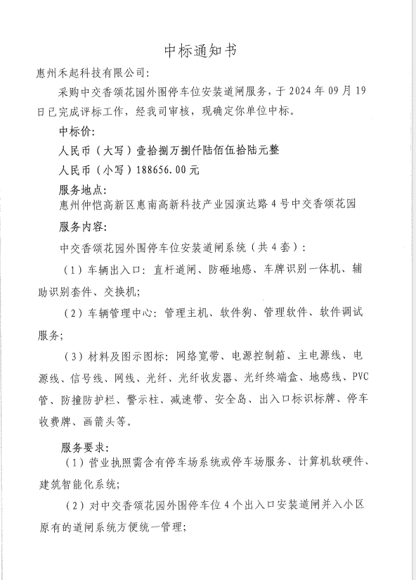 【中標(biāo)通知】采購中交香頌花園外圍停車位安裝道閘服務(wù)