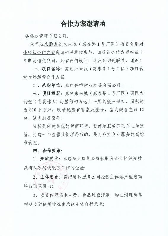 采購(gòu)惠創(chuàng)未來(lái)城(惠泰路1號(hào)廠區(qū))項(xiàng)目食堂對(duì)外經(jīng)營(yíng)合作方案