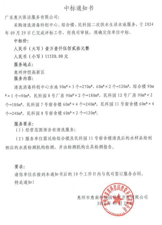 【中標通知】采購清洗消毒科創(chuàng)中心、綜合樓、民科園二次供水生活水池服務(wù)
