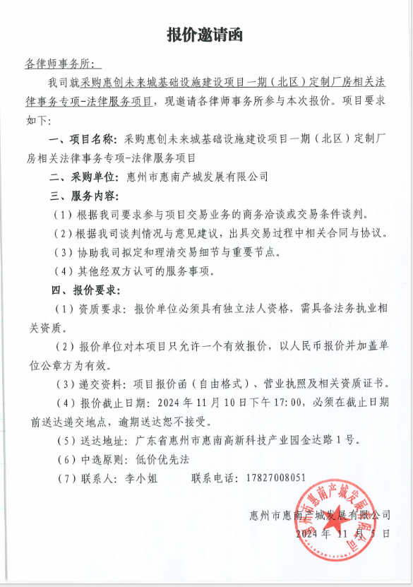 采購(gòu)惠創(chuàng)未來城基礎(chǔ)設(shè)施建設(shè)項(xiàng)目一期(北區(qū))定制廠房相關(guān)法律事務(wù)專項(xiàng)-法律服務(wù)項(xiàng)目