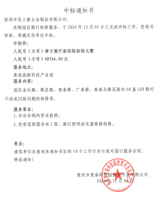 【中標通知】采購園區(qū)路燈檢修服務(wù)