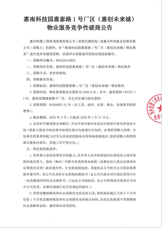 惠南科技園惠泰路1號(hào)廠區(qū)(惠創(chuàng)未來城) 物業(yè)服務(wù)競(jìng)爭(zhēng)性磋商公告
