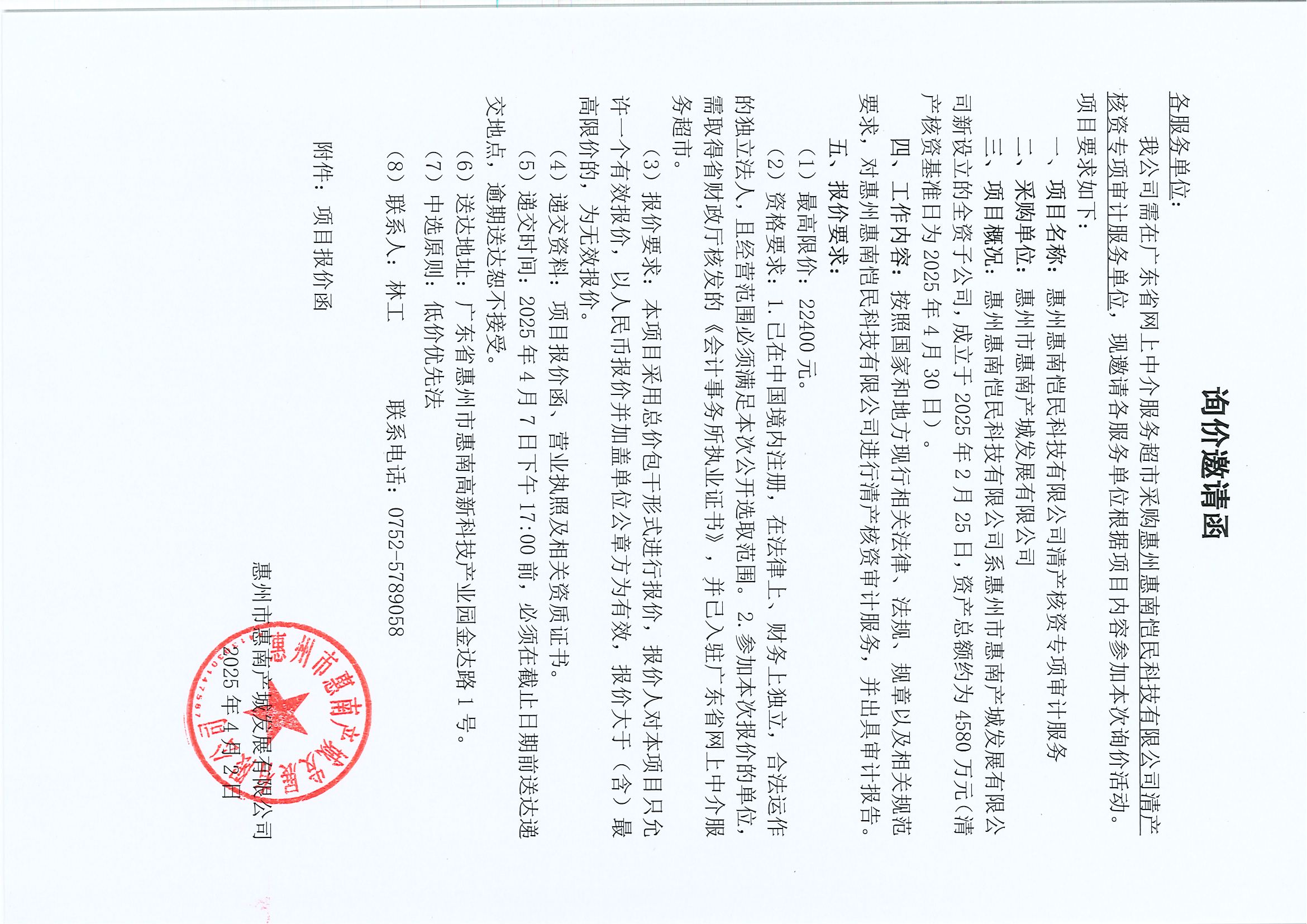 【詢價邀請函】惠州惠南愷民科技有限公司清產(chǎn)核資專項審計服務(wù)