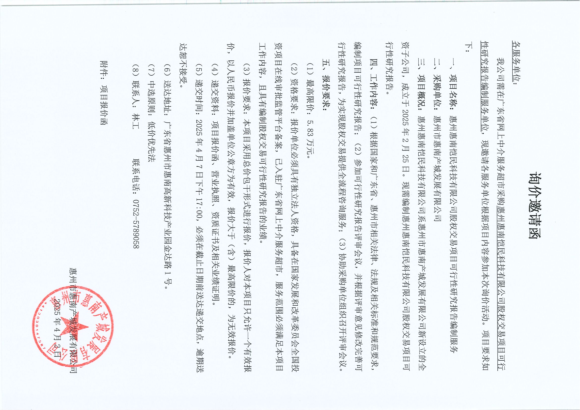 【詢價(jià)邀請(qǐng)函】惠州惠南愷民科技有限公司股權(quán)交易項(xiàng)目可行性研究報(bào)告編制服務(wù)
