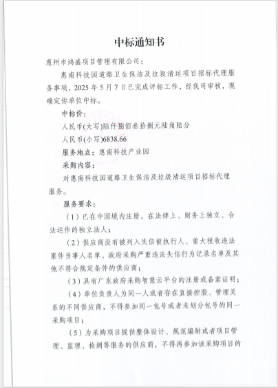 【中標(biāo)通知】惠南科技園道路衛(wèi)生保潔及垃圾清運(yùn)項(xiàng)目招標(biāo)代理服務(wù)事項(xiàng)
