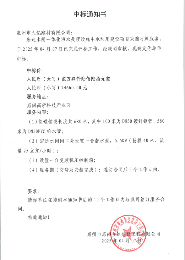 【中標(biāo)通知】宏達(dá)水閘一體化污水處理設(shè)施中水利用建設(shè)項(xiàng)目采購材料服務(wù)