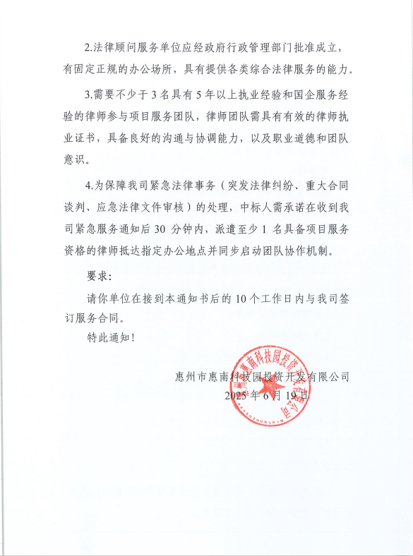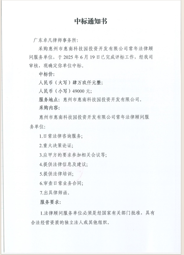 【中標(biāo)通知】惠州市惠南科技園投資開(kāi)發(fā)有限公司常年法律顧問(wèn)服務(wù)單位(二次)