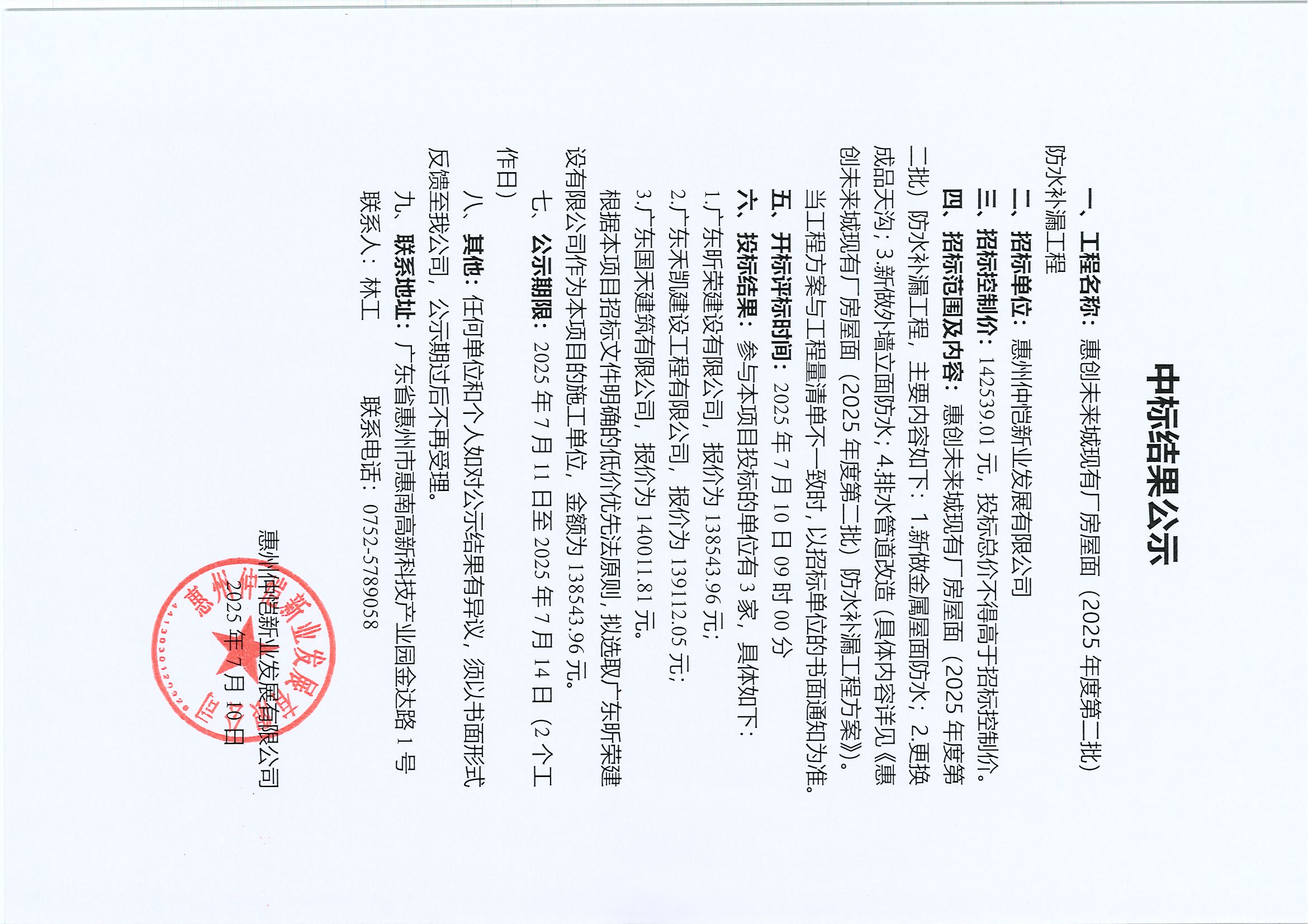 【中標(biāo)結(jié)果公示】惠創(chuàng)未來城現(xiàn)有廠房屋面(2025年度第二批)防水補(bǔ)漏工程