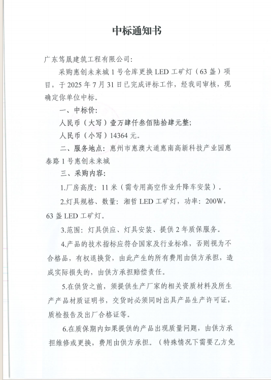 【中標(biāo)通知】采購惠創(chuàng)未來城1號倉庫更換LED工礦燈(63盞)項(xiàng)目