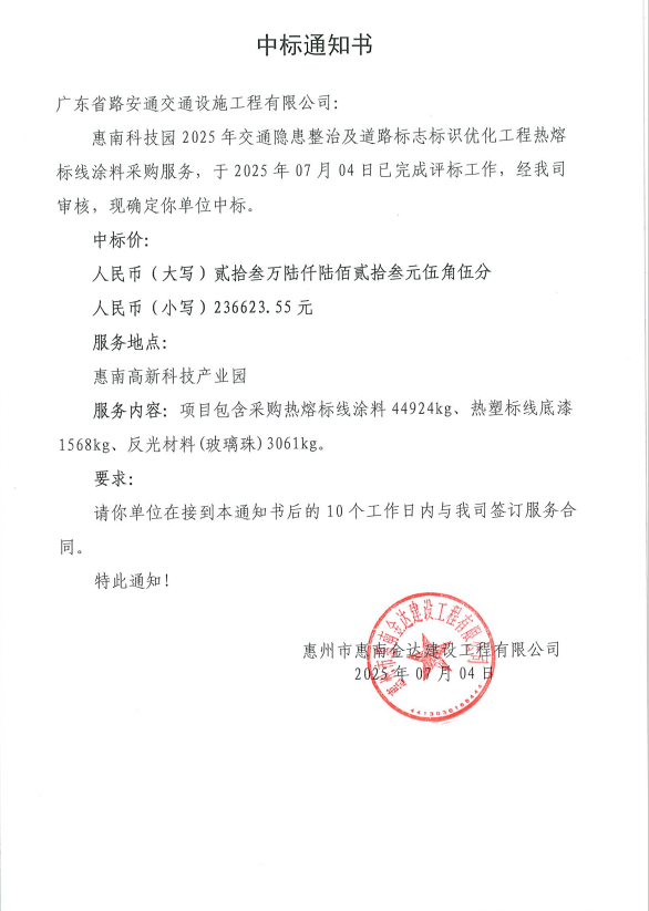 【中標(biāo)通知】惠南科技園2025年交通隱患整治及道路標(biāo)志標(biāo)識(shí)優(yōu)化工程熱熔標(biāo)線涂料采購(gòu)服務(wù)