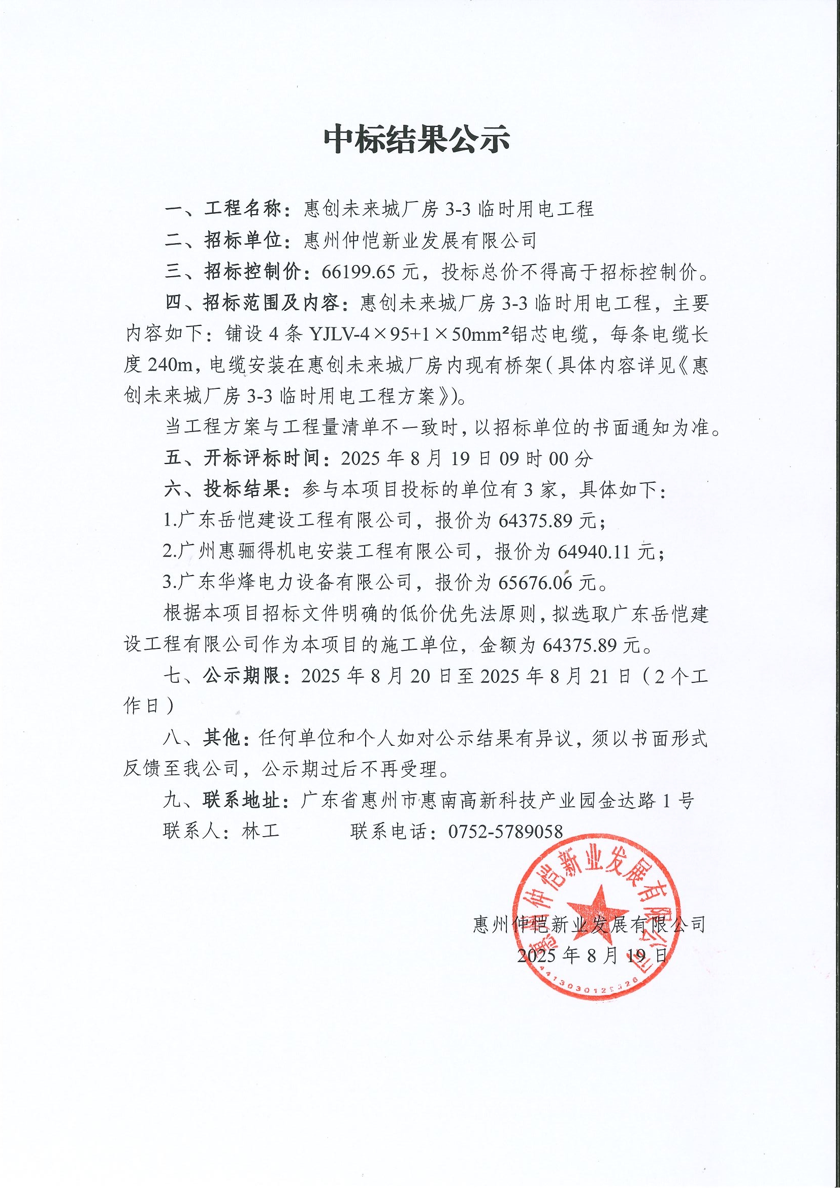 【中標結果公示】惠創(chuàng)未來城廠房3-3臨時用電工程