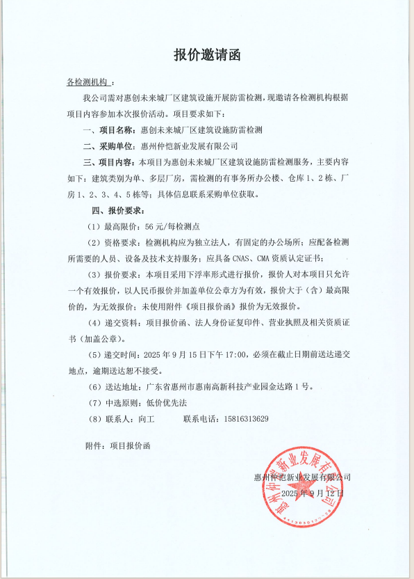 【報(bào)價(jià)邀請(qǐng)函】惠創(chuàng)未來城廠區(qū)建筑設(shè)施防雷檢測(cè)服務(wù)