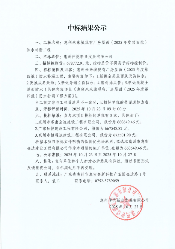 【中標結果公示】惠創(chuàng)未來城現(xiàn)有廠房屋面(2025年度第四批)防水補漏工程