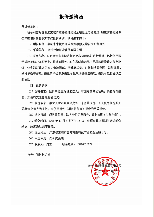 【報(bào)價(jià)邀請函】惠創(chuàng)未來城內(nèi)道路路燈維修及增設(shè)太陽能路燈