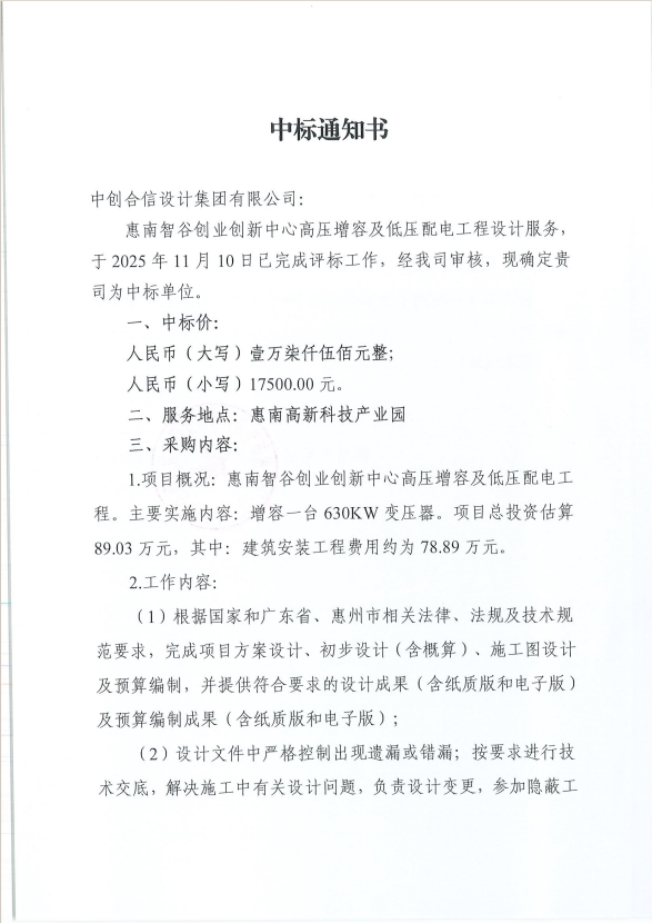 【中標(biāo)通知】惠南智谷創(chuàng)業(yè)創(chuàng)新中心高壓增容及低壓配電工程設(shè)計服務(wù)
