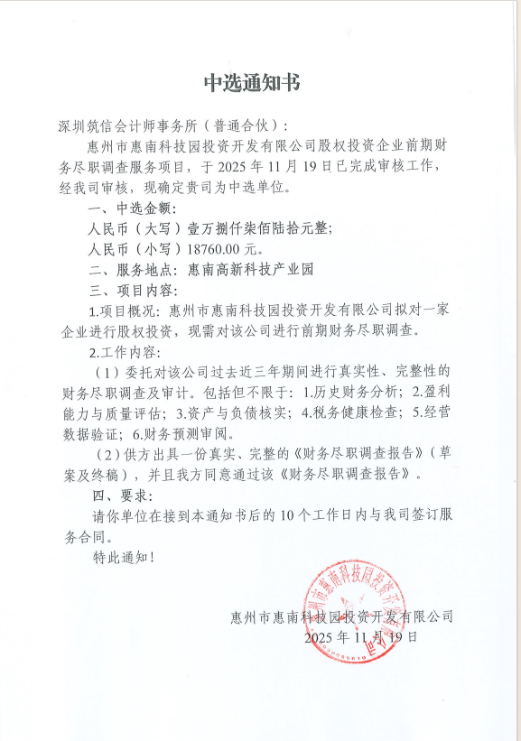 【中選通知】惠州市惠南科技園投資開發(fā)有限公司股權(quán)投資企業(yè)前期財(cái)務(wù)盡職調(diào)查服務(wù)項(xiàng)目