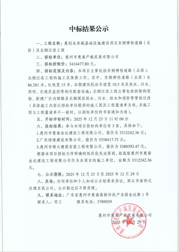 【中標結果公示】惠創(chuàng)未來城基礎設施建設項目東側彈性道路(北段)及北側遷改工程