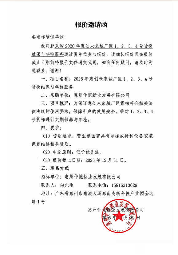 【報(bào)價(jià)邀請(qǐng)函】采購(gòu)2026年惠創(chuàng)未來(lái)城廠區(qū)1、2、3、4號(hào)貨梯維保與年檢服務(wù)