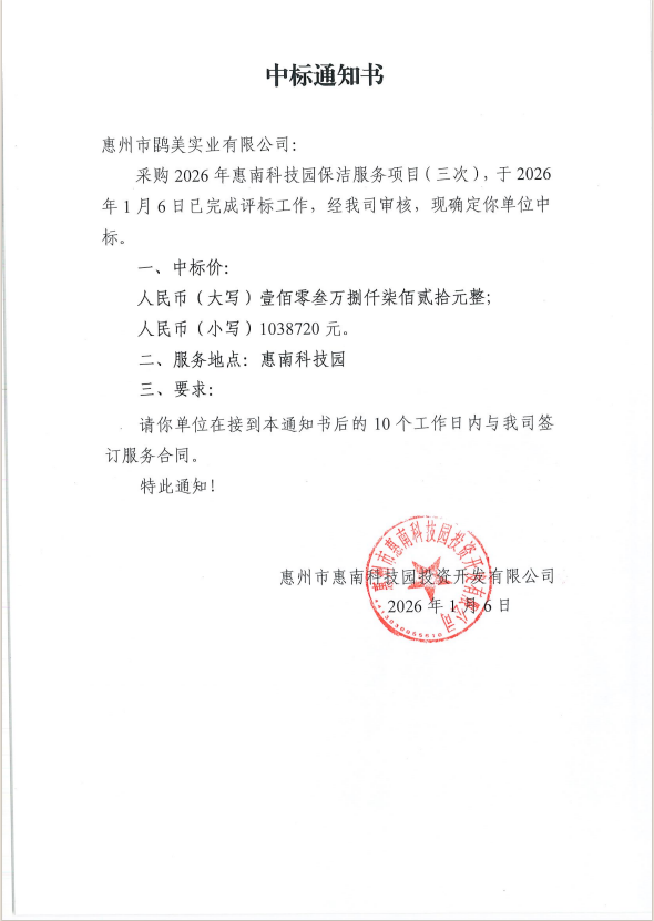 【中標通知】采購2026年惠南科技園保潔服務項目(三次)