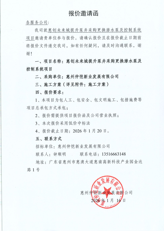 【報價邀請函】惠創(chuàng)未來城提升泵井采購更換潛水泵及控制系統(tǒng)項目