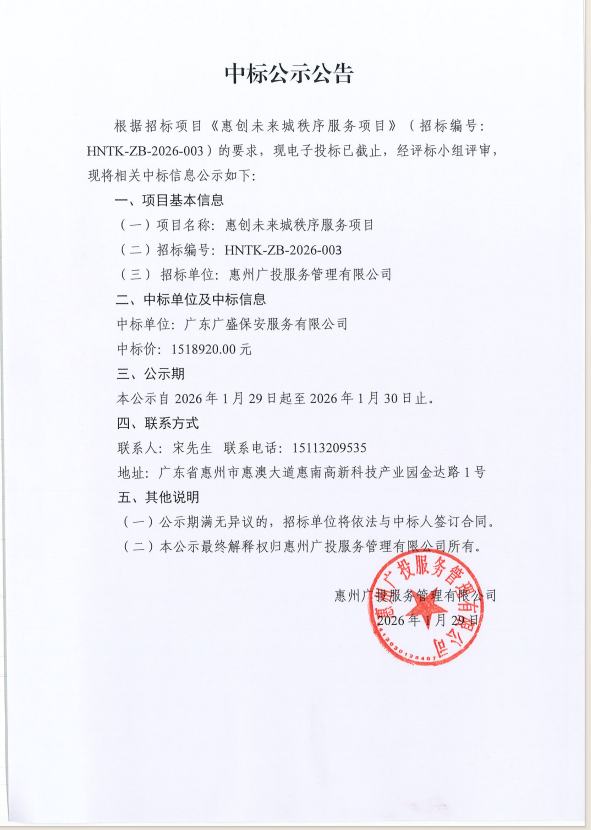 【中標公示】惠創(chuàng)未來城秩序服務項目